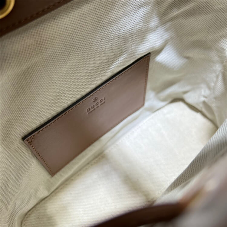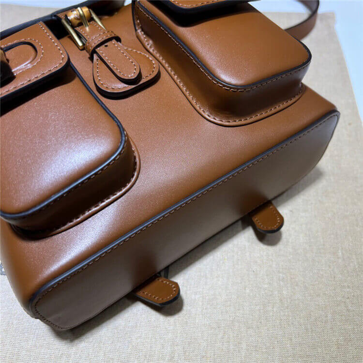 1:1 Mirror Quality Replica Gucci Bamboo Backpack Style:702101 UZY0T 2535 Brown leather Gold-toned and bamboo hardware Front double pockets with bamboo closure Bamboo handle with 2.3″ drop Adjustable double shoulder straps Flap with buckle closure and interior drawstring closure 8.6″W x 8.6H x 3.27″D