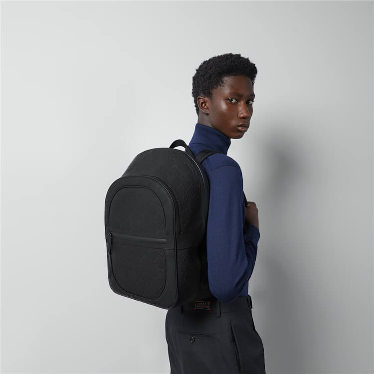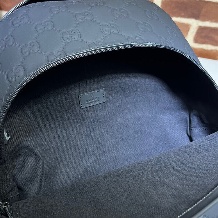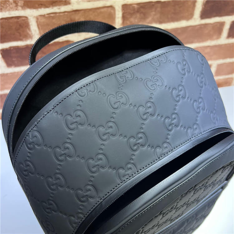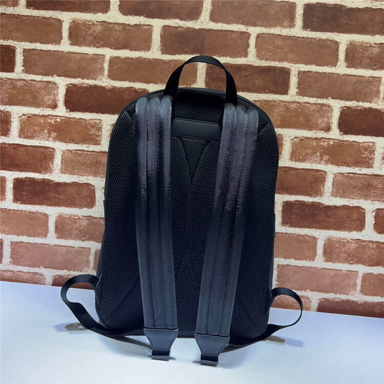 1:1 Mirror Quality Replica Gucci GG Backpack Style:771280 AAC4E 1000 Black GG rubber-effect leather Cotton linen lining Adjustable shoulder straps Padded mesh back Outside: 2 side zip pockets Top handle with 2.4″ drop Zip closure 10.2″W x 13.4″H x 5.5″D