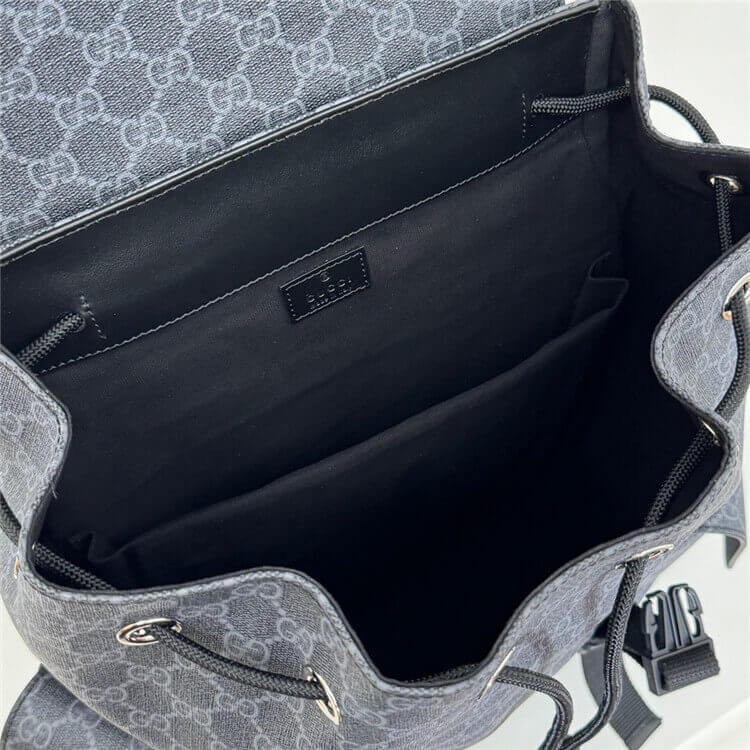 1:1 Mirror Quality Replica Gucci GG Backpack Style:792080 FADJQ 1185 Black GG Supreme canvas Black leather trim Blue and red Web Cotton linen lining Padded mesh back Canvas shoulder straps Two side pockets with buckle closure Top handle with 8cm drop Drawstring closure with flap W35cm x H46cm x D12cm