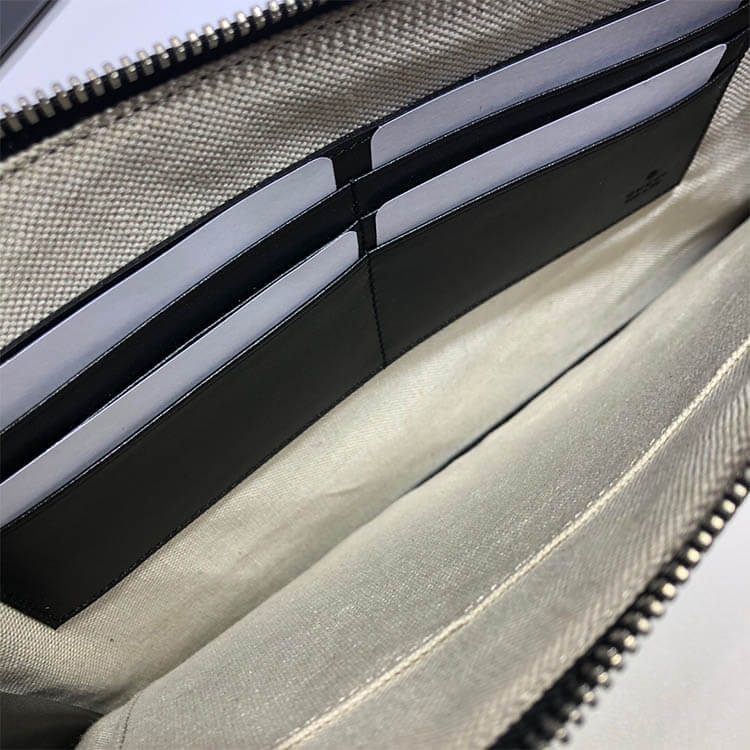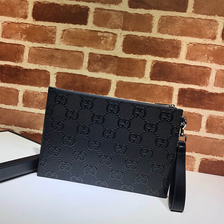 1:1 Mirror QualityReplica Gucci GG Embossed PouchStyle:625569 1W3AN 1000Black GG embossed leatherInterior: 6 card slots and 1 open pocketDetachable wrist strap with 4.7″ dropZipper closure12″W x 8.3″H x .6″D