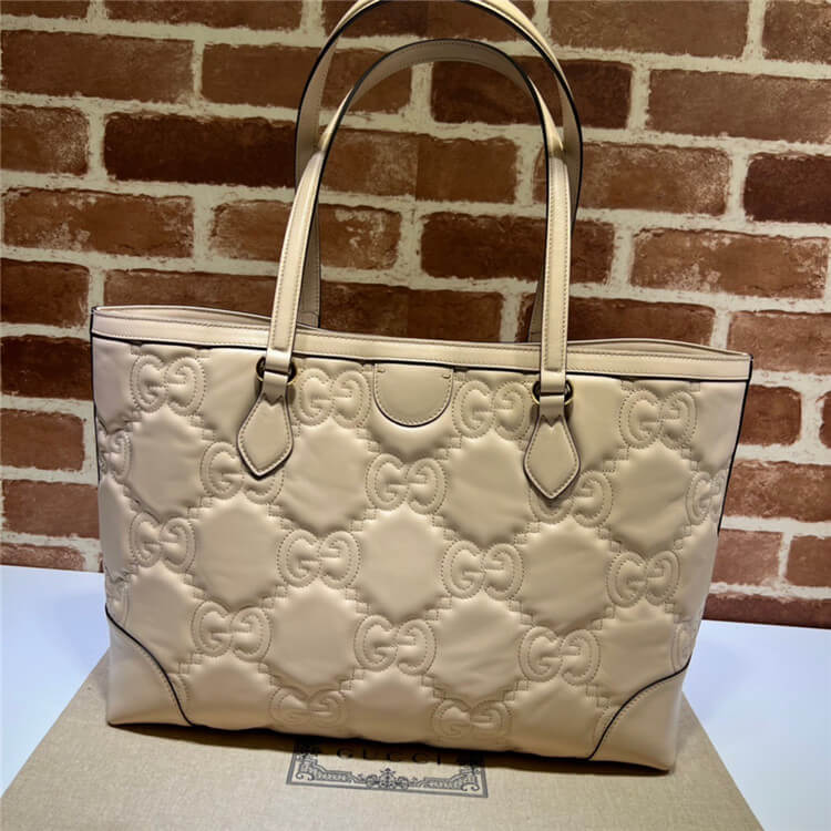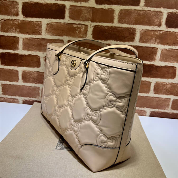 1:1 Mirror Quality Replica Gucci GG Matelasse Medium Tote Style:631685 UM8IG 9500 Beige GG Matelassé leather Gold-toned hardware Double G Interior zipper pocket Double leather handles with 10″ drop and 21″ length Magnetic snap closure Weight: .71kg approximately Medium size: 15″W x 11″H x 5.5″D