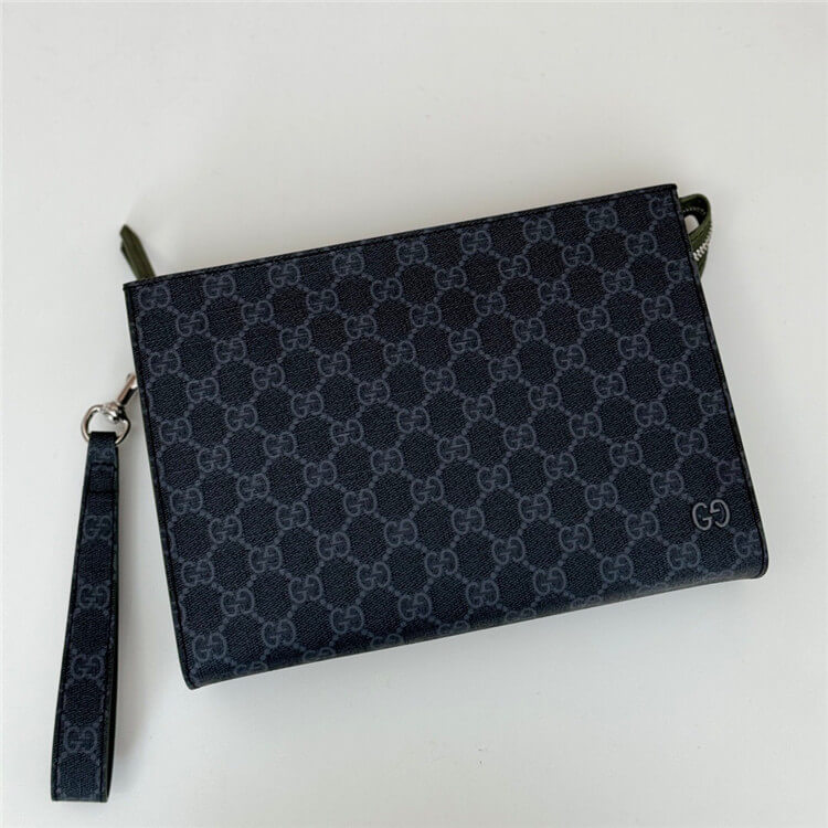 1:1 Mirror Quality Replica Gucci GG Pouch With GG Detail Style: 768255 FACQC 1049 Black GG Supreme canvas Dark green leather trim Brass hardware with dark grey ceramic-effect finishing GG detail Inside: 6 card slots Detachable wrist strap Zip closure 10.2″W x 7″H x 2.4″D