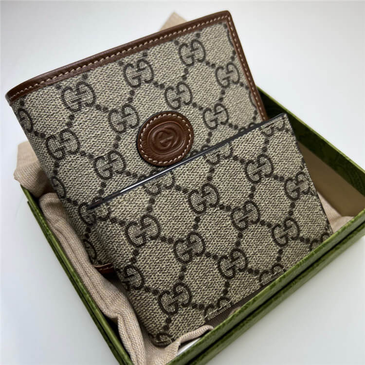 1:1 Mirror Quality Replica Gucci GG Wallet With Removable Card Case Style:723171 92TCG 8563 Beige and ebony GG Supreme canvas Brown leather trim Oval Interlocking G leather tag Inside: 8 card slots, 1 bill compartment and 1 removable card case Closed: 4.5″W x 3.5″H Open: 9.4″W x 3.5″H