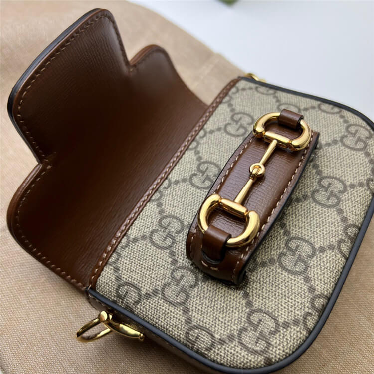 1:1 Mirror Quality Replica Gucci Horsebit 1955 Strap Wallet Style:699760 HUHHG 8565 Beige and ebony GG Supreme canvas Gold-toned hardware Moiré lining with microfiber finish Horsebit Inside: 1 card slot Handle with 3.1″ drop Web shoulder strap with 13.4″ drop 4.7″W x 3.5″H x 1.6″D Weight: 0.32kg approximately
