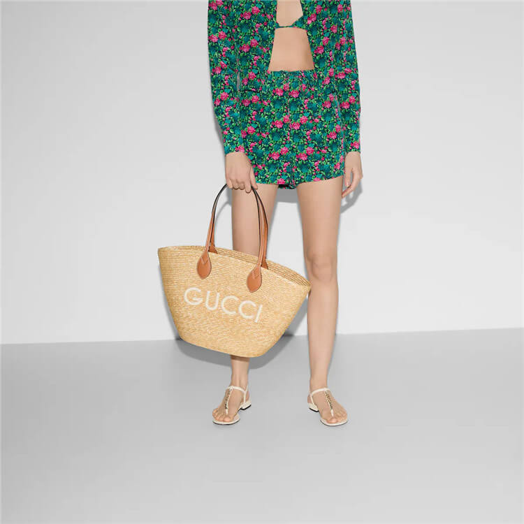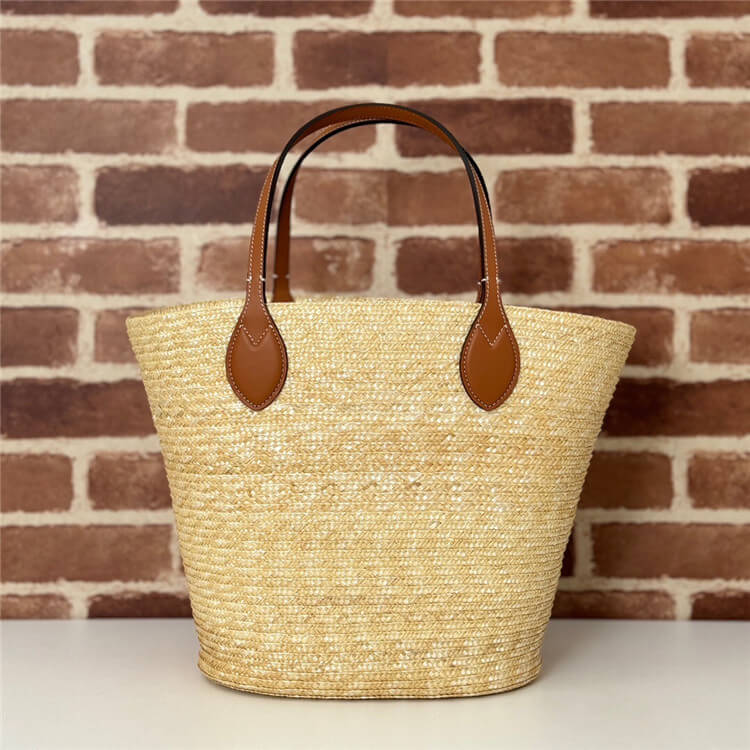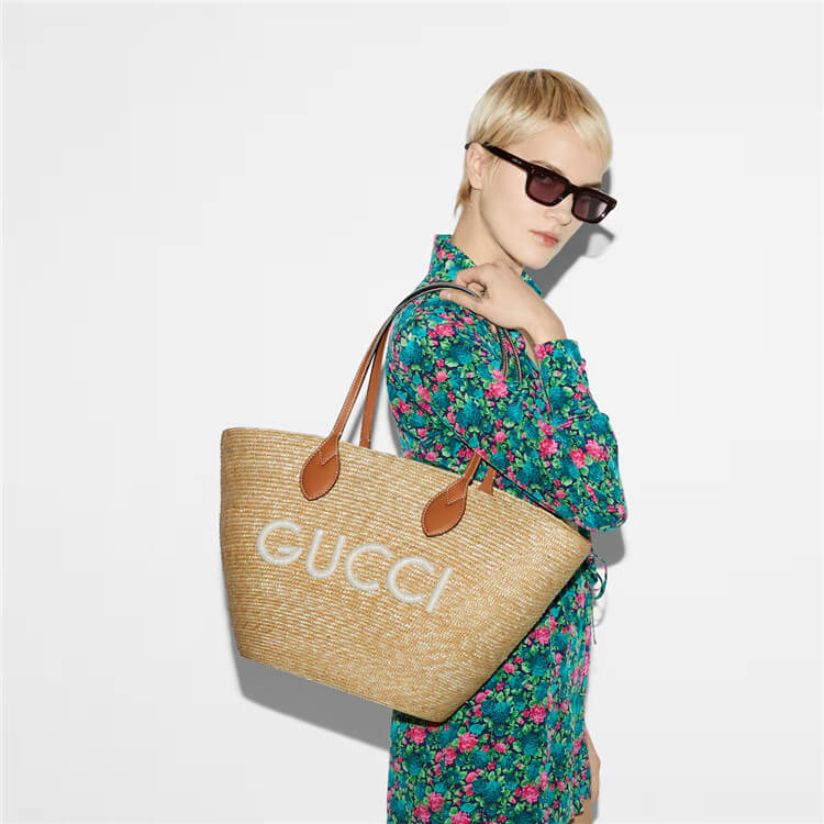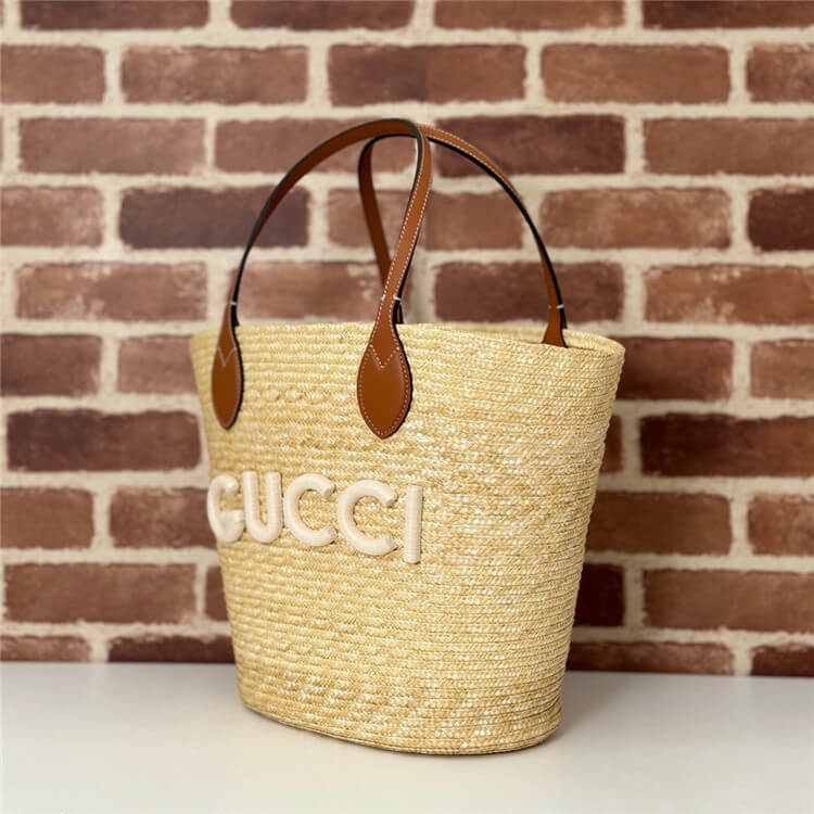 1:1 Mirror QualityReplica Gucci Medium Straw Tote With Gucci PatchStyle:779530 9AAE9 9541Natural wheat strawBrown leather trimStraw Gucci patchCotton linen liningInside: 1 open pocketTop handle with 9.4″ dropMedium: 10.2″W x 11.4″H x 7.1″D