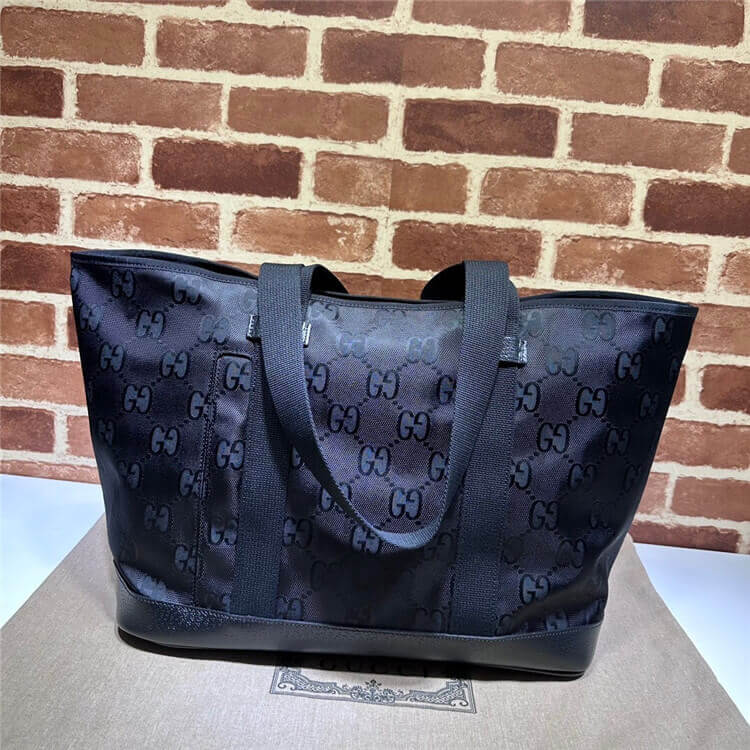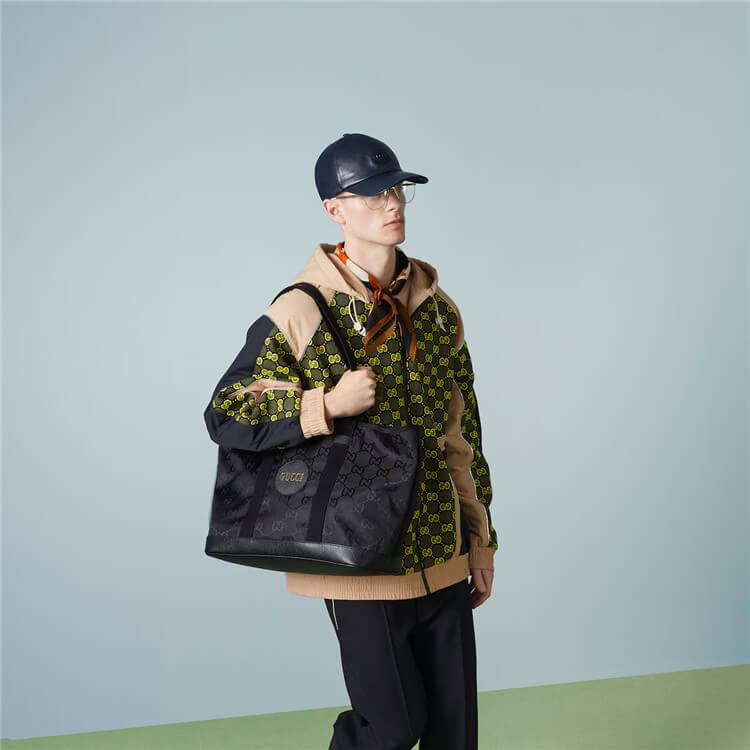 1:1 Mirror Quality Replica Gucci Off The Grid Medium Tote Style:746037 H9HBN 1000 Black GG nylon Black leather trim Nylon lining Leather detail with Gucci script logo Inside: 1 zip pocket Handle with 2.5″ drop Shoulder strap with 11.8″ drop 15.3″W x 13″H x 7.5″D