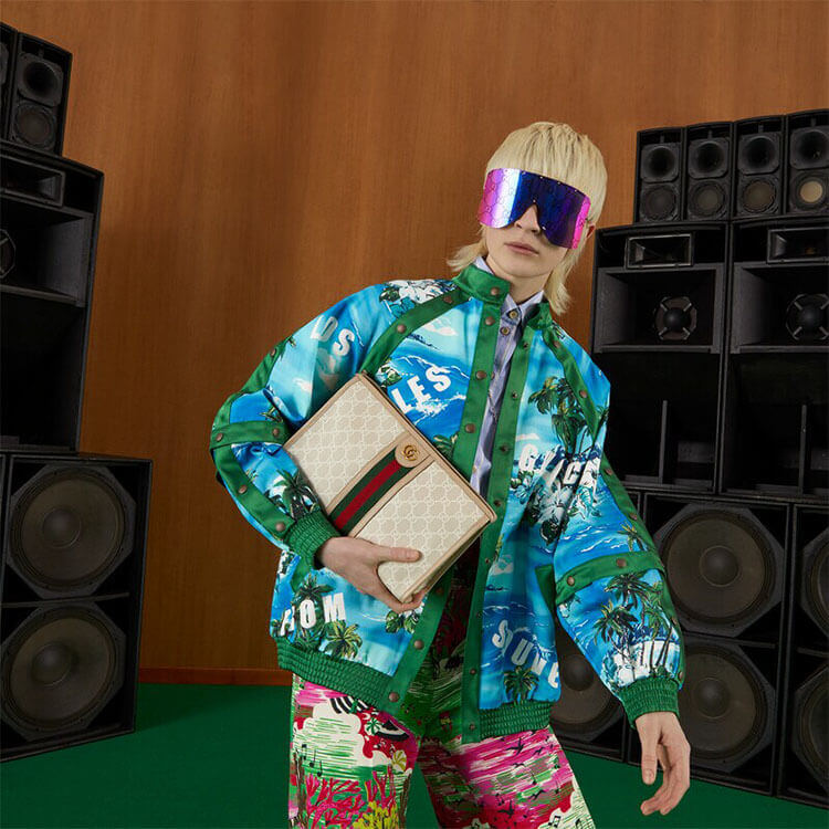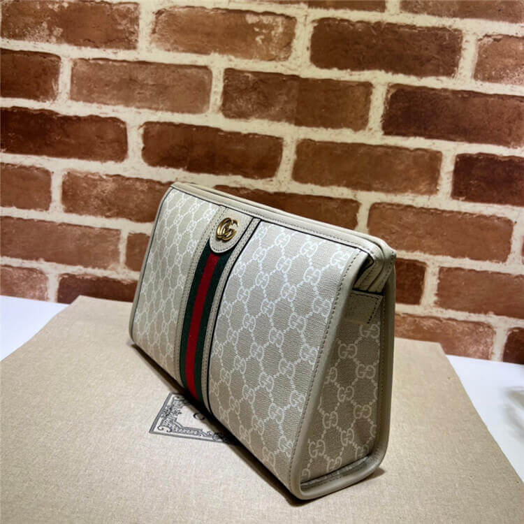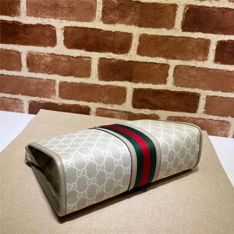 1:1 Mirror Quality Replica Gucci Ophidia GG Toiletry Case Style:598234 UULAG 9682 Beige and white GG Supreme canvas Oatmeal leather trim Antique gold-toned hardware Green and red Web Cotton linen lining Double G Interior zipper pocket Zipper closure 11.2″W x 7″H x 3.5″D The model is 5’7″ tall
