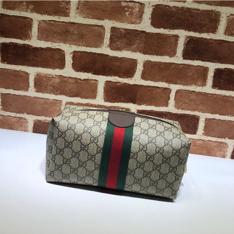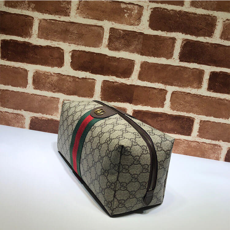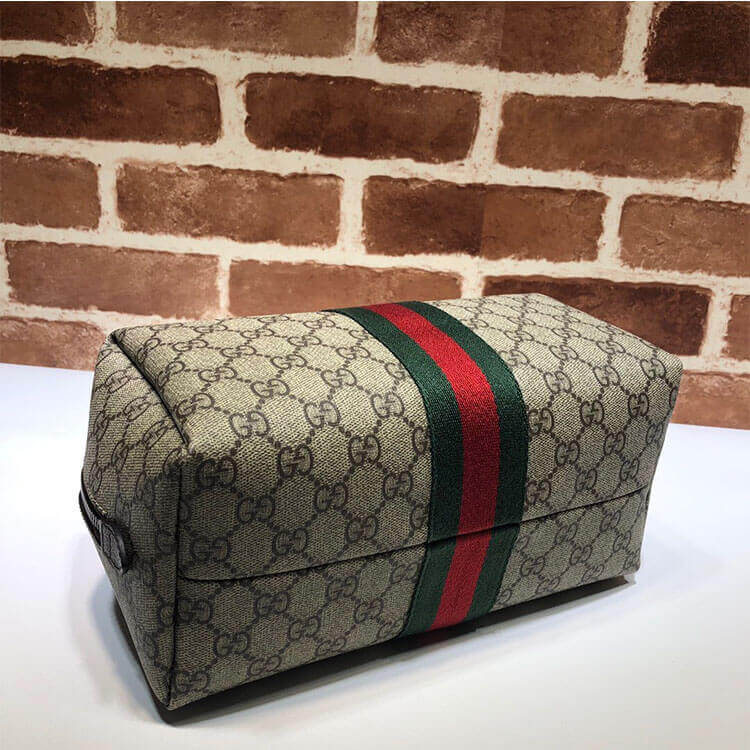 1:1 Mirror Quality Replica Gucci Savoy Medium GG Toiletry Case Style: 572767 9IK3T 8745 Beige/ebony soft GG Supreme with brown leather trim Green and red Web Antique gold-toned hardware Double G Interior open pocket Zipper closure Weight: .7lbs approximately 10.2″W x 4.9″H x 4.7″D