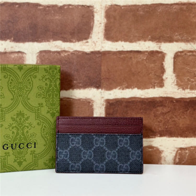 1:1 Mirror Quality Replica Gucci Bi-Color GG Card Case Style:768248 FADMR 1050 Black GG Supreme canvas Bordeaux leather trim Brass hardware with dark grey ceramic-effect finishing Moiré lining GG detail Four card slots, one open pocket 4.3″W x 2.7″H Weight: 0.06lbs approximately