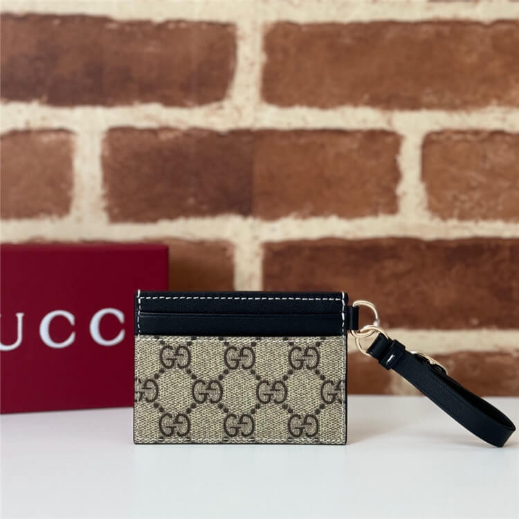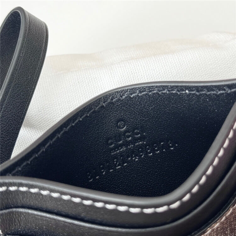 1:1 Mirror Quality Replica Gucci GG Emblem Card Case With Strap Style:819121 FAD6L 9741 Beige and brown new GG Monogram coated fabric Black leather trim Taffeta lining Inside: 4 card slots (2 for each side) and 1 card slot on the top Leather wrist strap 4″W x 2.7″H Weight: 0.14lbs approximately