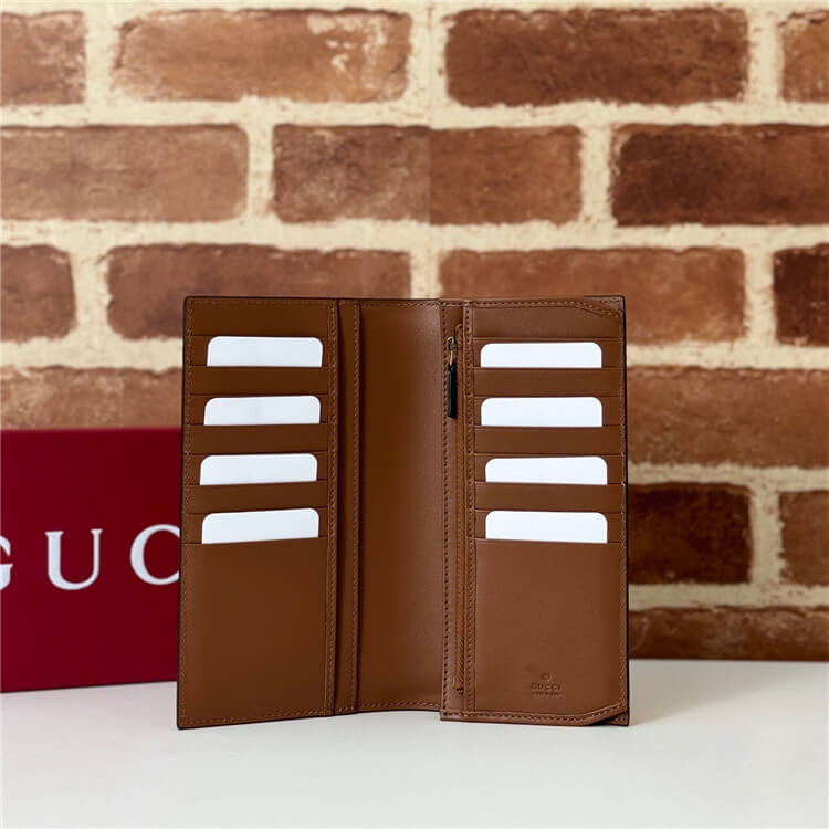 1:1 Mirror Quality Replica Gucci GG Emblem Long Wallet Style:821213 FAED0 9786 Beige and dark brown new GG Monogram coated fabric Brown leather interior Inside: 16 card slots, 1 zip pocket, 3 open pockets Weight: 148g approximately Closed: W10cm x H19cm x D2cm; Open: W20.5cm x H19cm