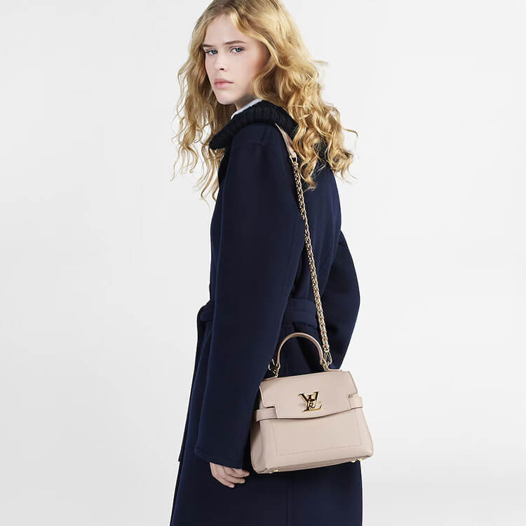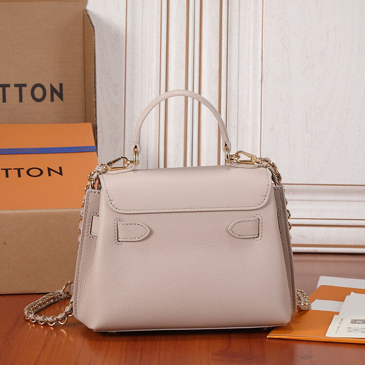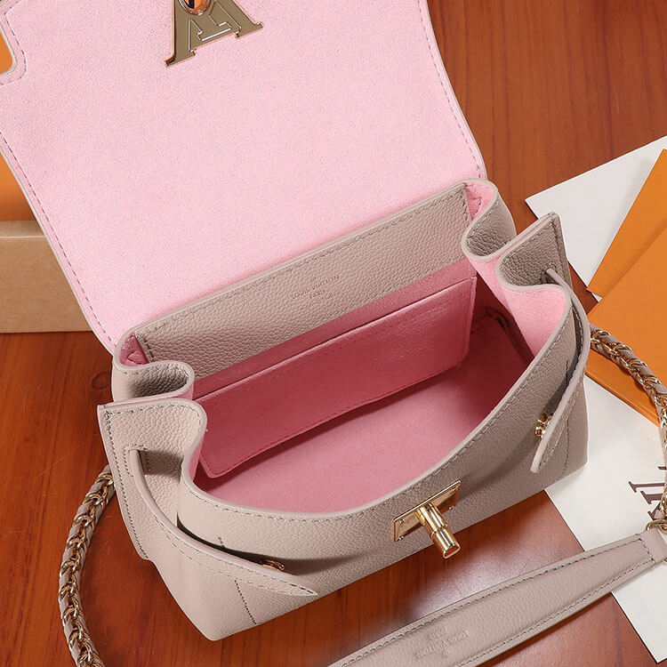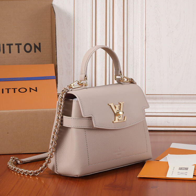 1:1 Mirror Quality Replica LV LockMe Ever Mini Style:M21052 23 x 17 x 10 cm Greige Grained calf leather Grained calf-leather trim Microfiber lining Gold-colour hardware 2 inside flat pockets 4 protective metal bottom studs Strap: Removable, not adjustable Strap drop:48.0 cm Handle: Single