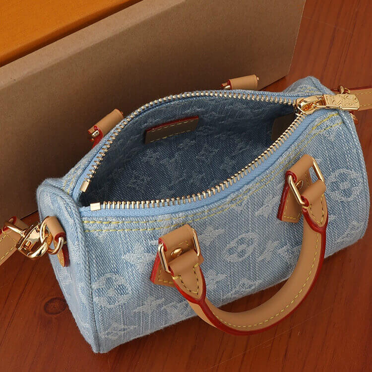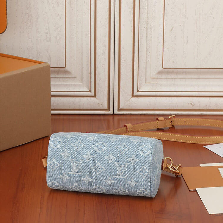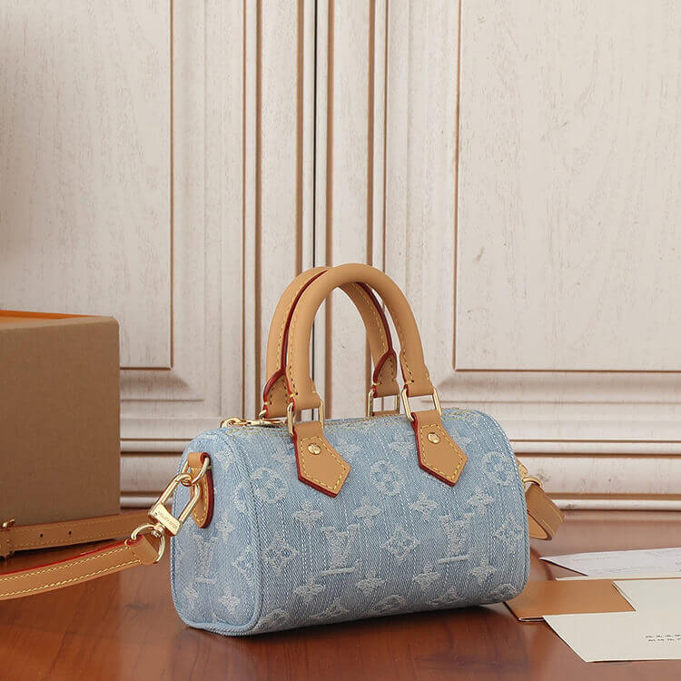 1:1 Mirror QualityReplica LV Nano SpeedyStyle:M112126.3 x 3.9 x 3 inches(length x Height x Width)Sky BlueMonogram denimNatural cowhide-leather trimMonogram denim liningGold-color hardwareZip closureStrap:Removable, adjustableStrap drop:17.9 inchesStrap drop max:21.3 inchesHandle:Double