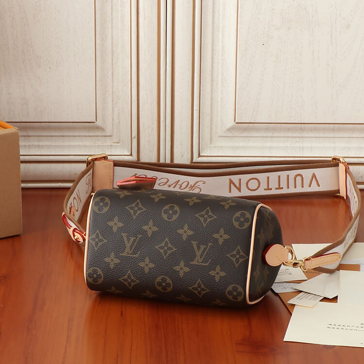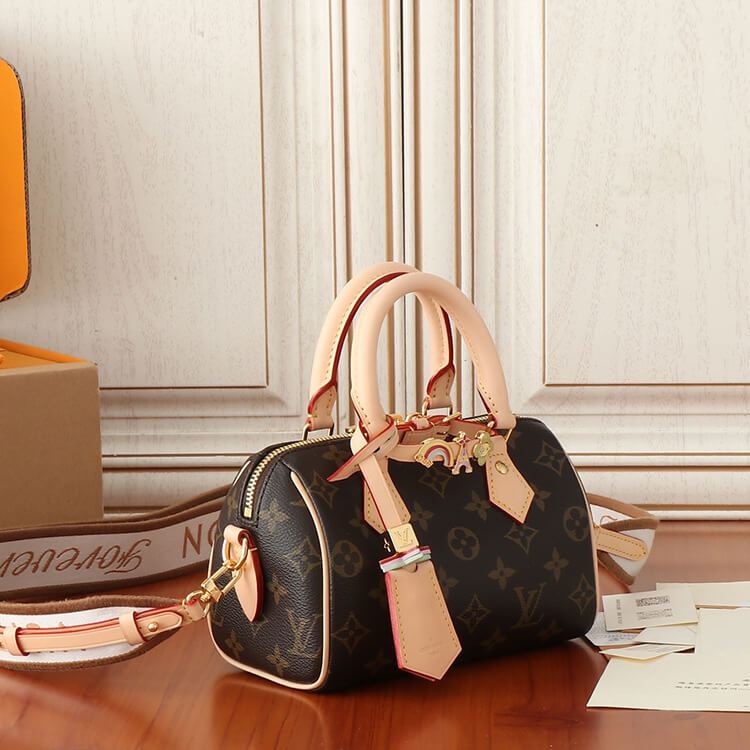 1:1 Mirror Quality Replica LV Speedy 18 LV&I Style:M46970 18.5 x 12.5 x 10.5 cm (length x height x width) Monogram coated canvas Cowhide leather trim Fabric lining Metal Parts Interior flap pocket Detachable strap with insertable embellishment Handle: Double handle