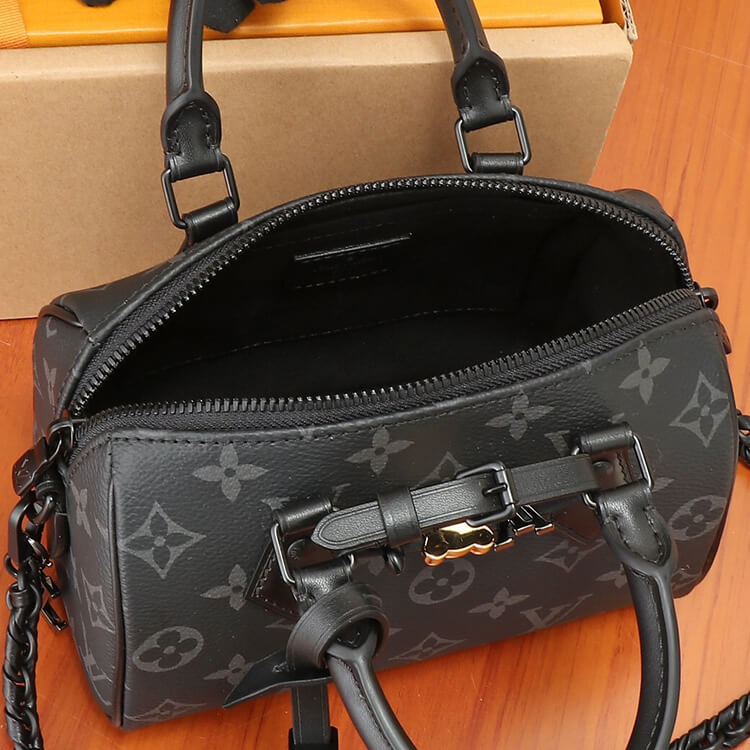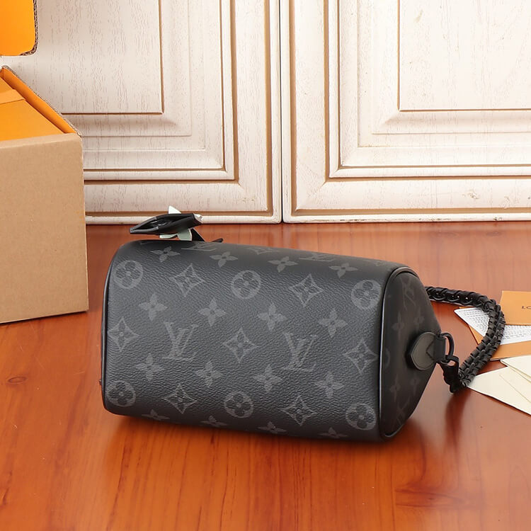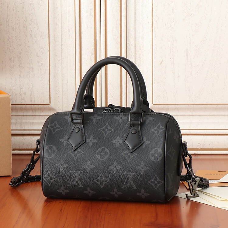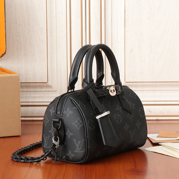 1:1 Mirror Quality Replica LV Speedy 18 LV&I Style:M24474 18.5 x 12.5 x 10.5 cm (length x height x width) Monogram Eclipse coated canvas Cowhide leather trim Fabric lining Metal Parts Interior flap pocket Detachable strap with insertable embellishment Handle: Double handle