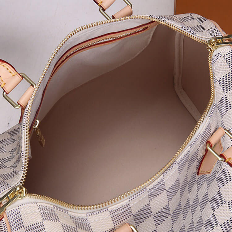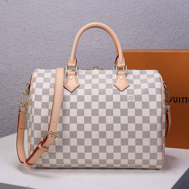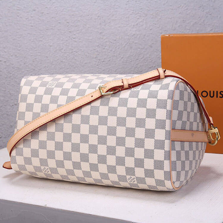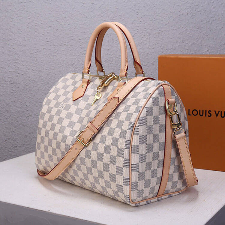 1:1 Mirror QualityReplica LV Speedy Bandouliere 30Style:N41373Size:11.8”W x 8.3”H x 6.7”DDamier Azur coated canvasSmooth cowhide-leather trimTextile liningGold-color hardwareDouble zipPadlockInside flat pocketStrap:Removable, adjustableStrap drop: 18.9 inchesStrap drop max: 21.7 inches