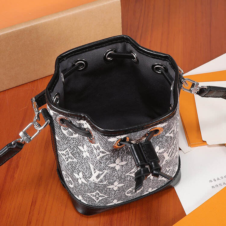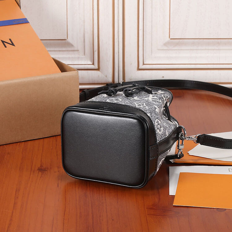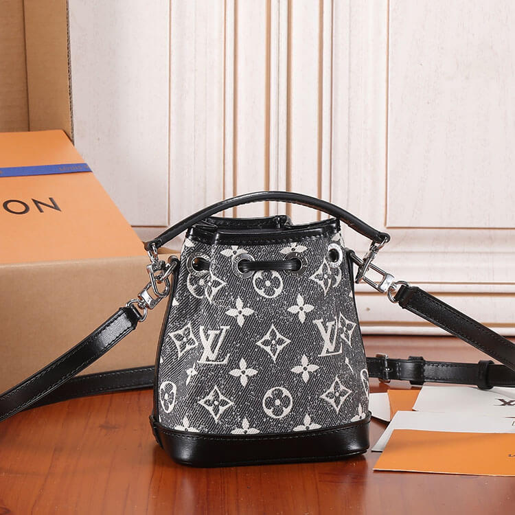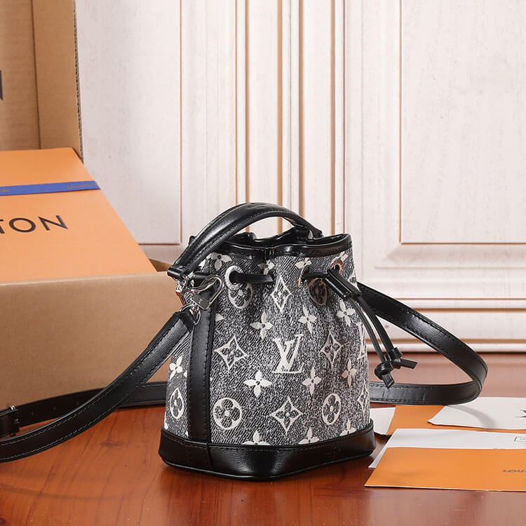 1:1 Mirror Quality Replica LV Nano Noe Style:M46449 13 x 16 x 10 cm Gray Monogram Jacquard Denim Cowhide-leather trim Reverse Jacquard Denim lining Silver-color hardware Drawstring closure Strap: Removable, adjustable Strap drop:45.5 cm Strap drop max:54.0 cm Handle: Single, removable