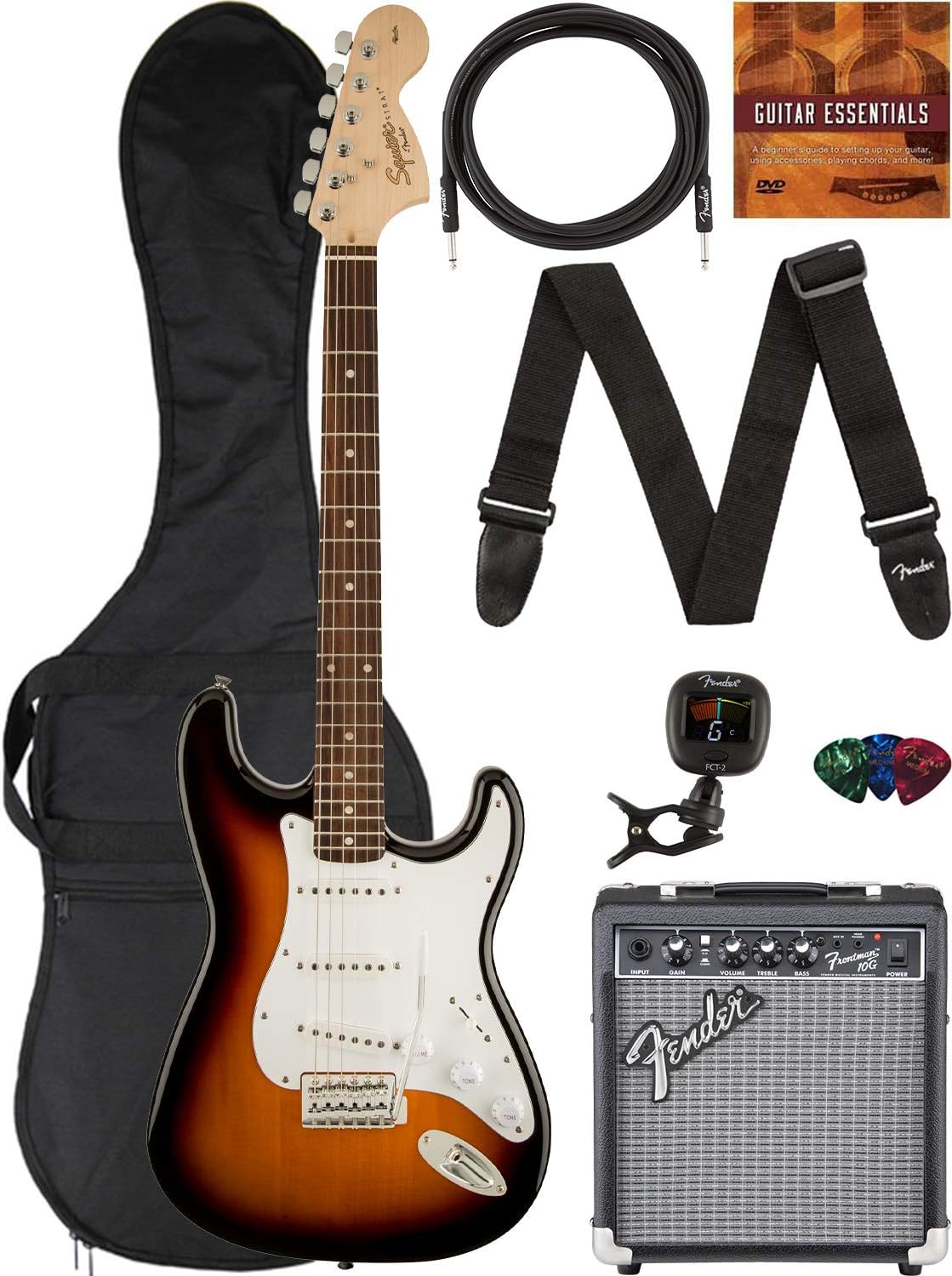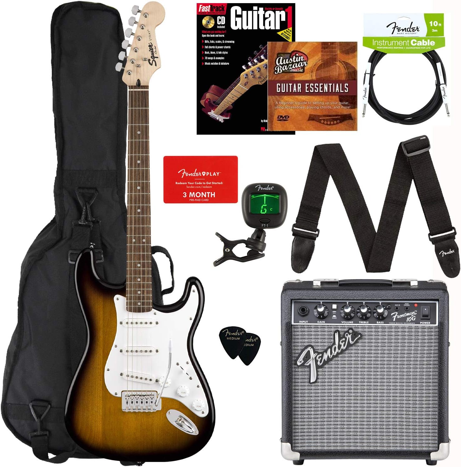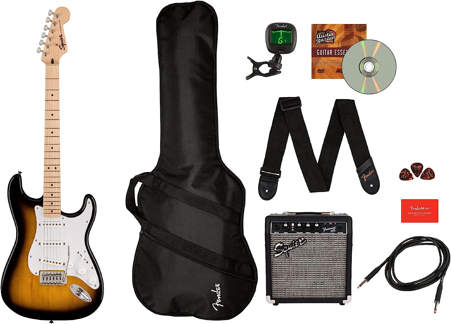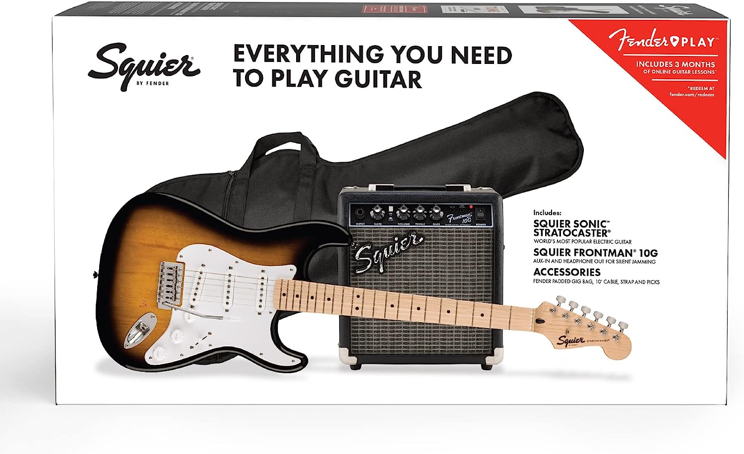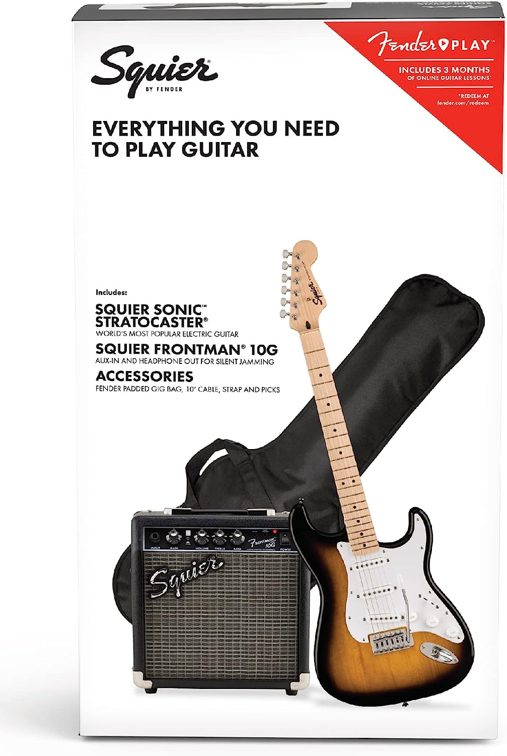 • Fender Squier Stratocaster - Sunburst Bundle with Frontman 10G Amp, Gig Bag, Instrument Cable, Tuner, Strap, Picks, Fender Play Online Lessons, Instructional Book, and Austin Bazaar Instructional DVD