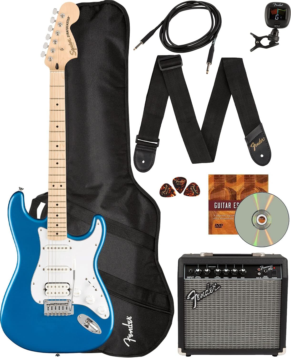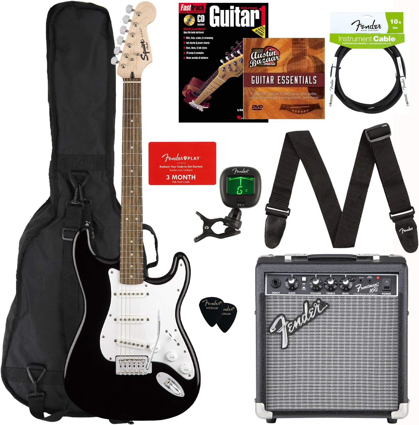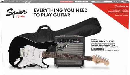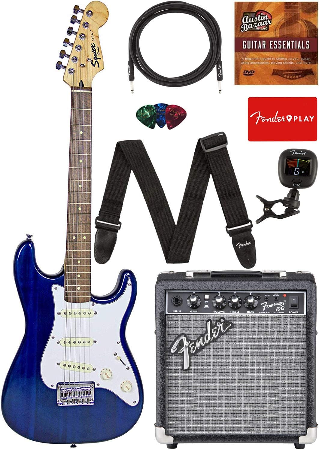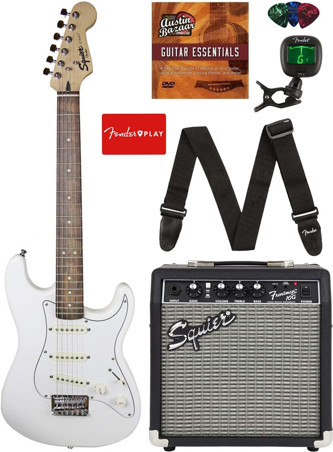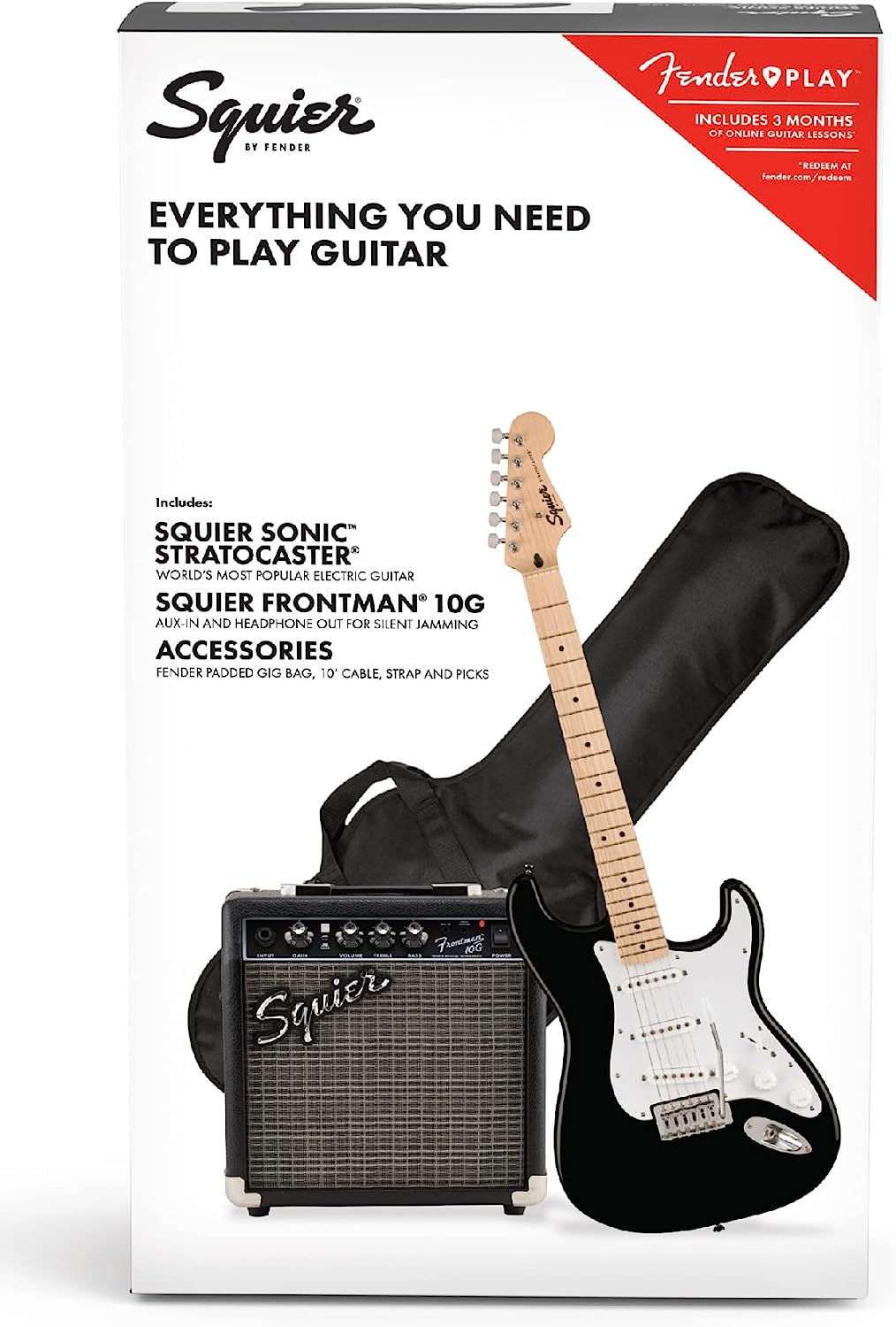 • Fender Squier Stratocaster - Sunburst Bundle with Frontman 10G Amp, Gig Bag, Instrument Cable, Tuner, Strap, Picks, Fender Play Online Lessons, Instructional Book, and Austin Bazaar Instructional DVD