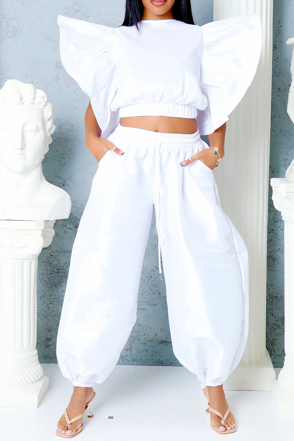 • Plus Size Daily White Round Neck Flutter Sleeve Short Sleeve With Pocket Two Pieces Pant Sets