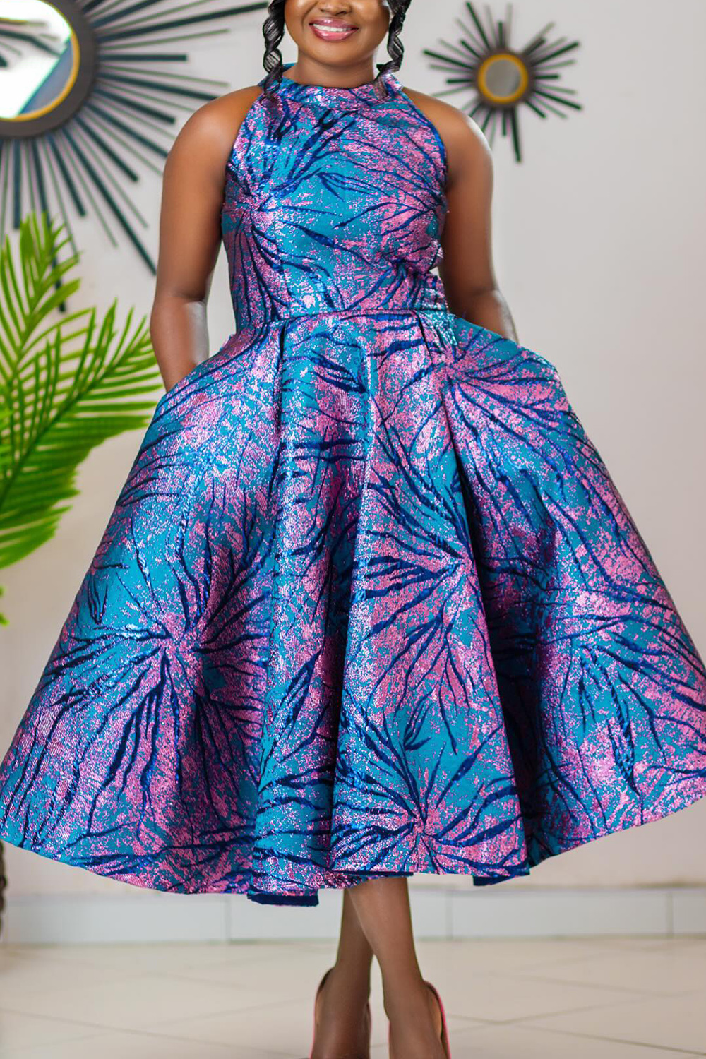 Plus Size Formal Blue All Over Print Round Neck Pocket Satin Midi Dresses