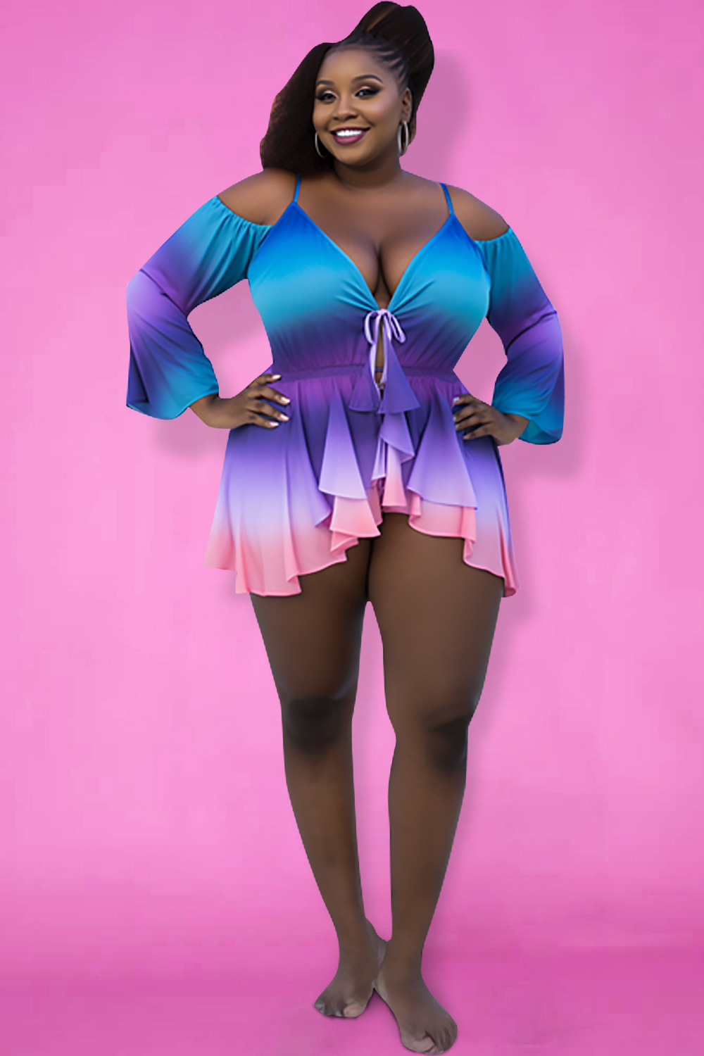 • Xpluswear Design Plus Size Beach Blue Gradient V Neck Cold Shoulder Long Sleeve Lace Up Swimsuit Fabric Two Pieces Swimsuit (With Panty)