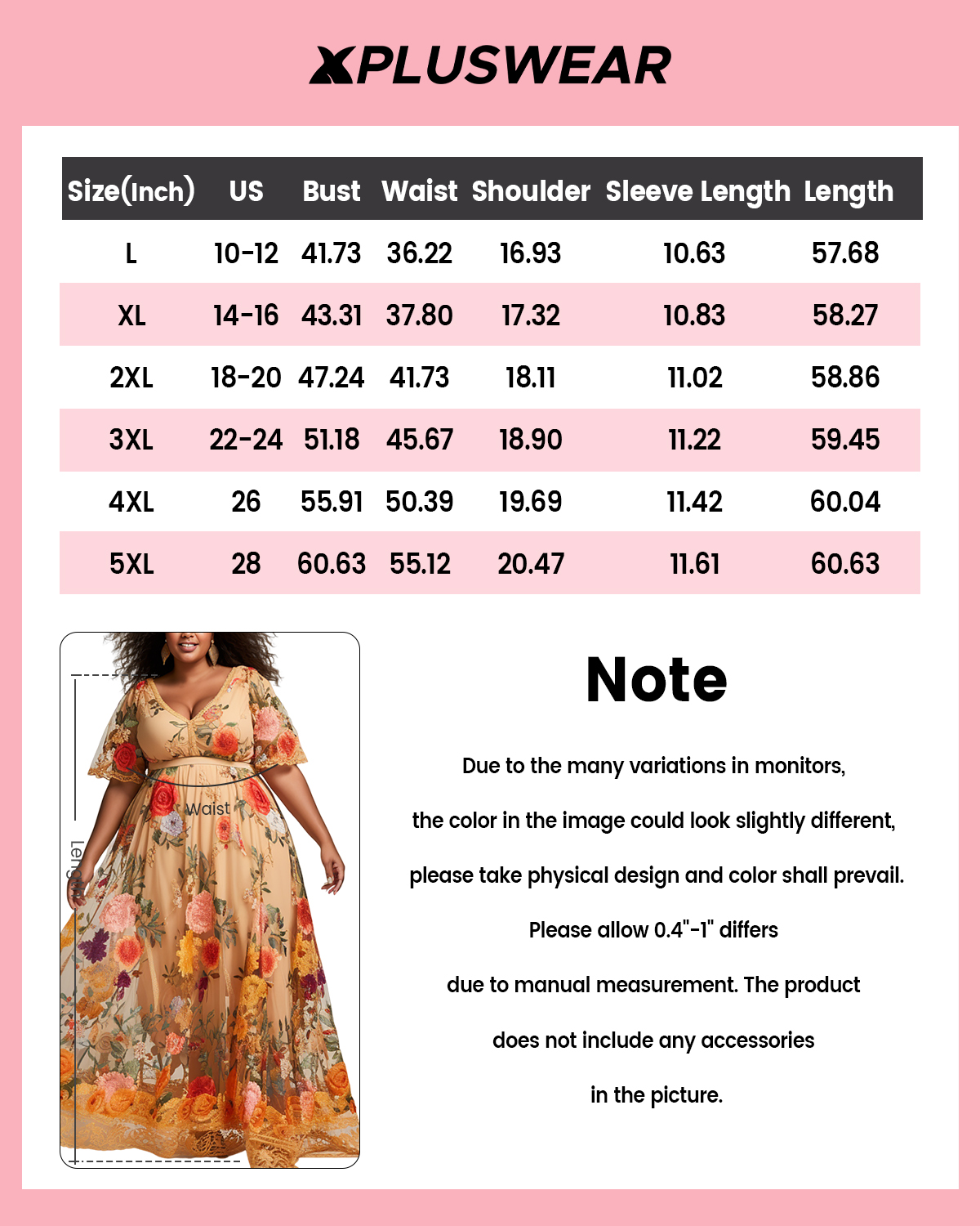 • Xpluswear Design Plus Size Beach Elegant Orange Floral V Neck Short Sleeve Lace Maxi Dresses