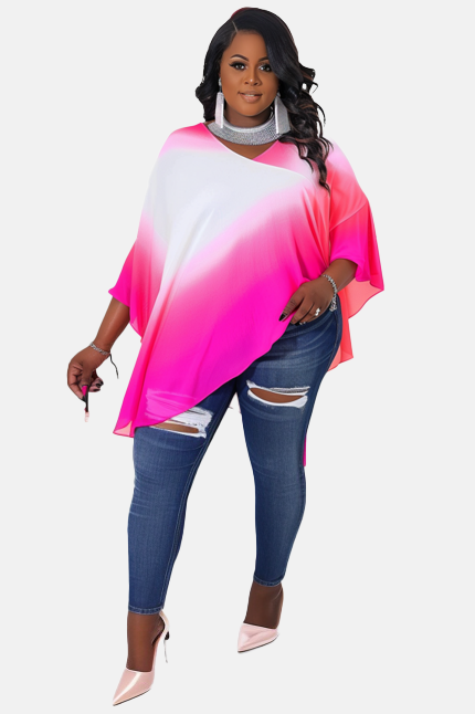 • Xpluswear Design Plus Size Daily Hot Pink Gradient Wrap Neck Batwing Sleeve 3/4 Sleeve Asymmetric Hem Tops
