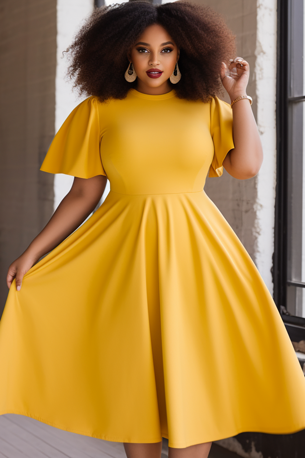 • Xpluswear Design Plus Size Daily Yellow Round Neck Flare Short Sleeve Knitted Midi Dresses
