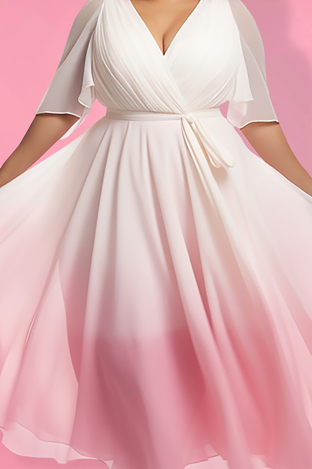 • Xpluswear Design Plus Size Semi Formal Pink Gradient V Neck Petal Sleeve Half Sleeve Crinkle Chest Wrap Chiffon Midi Dresses